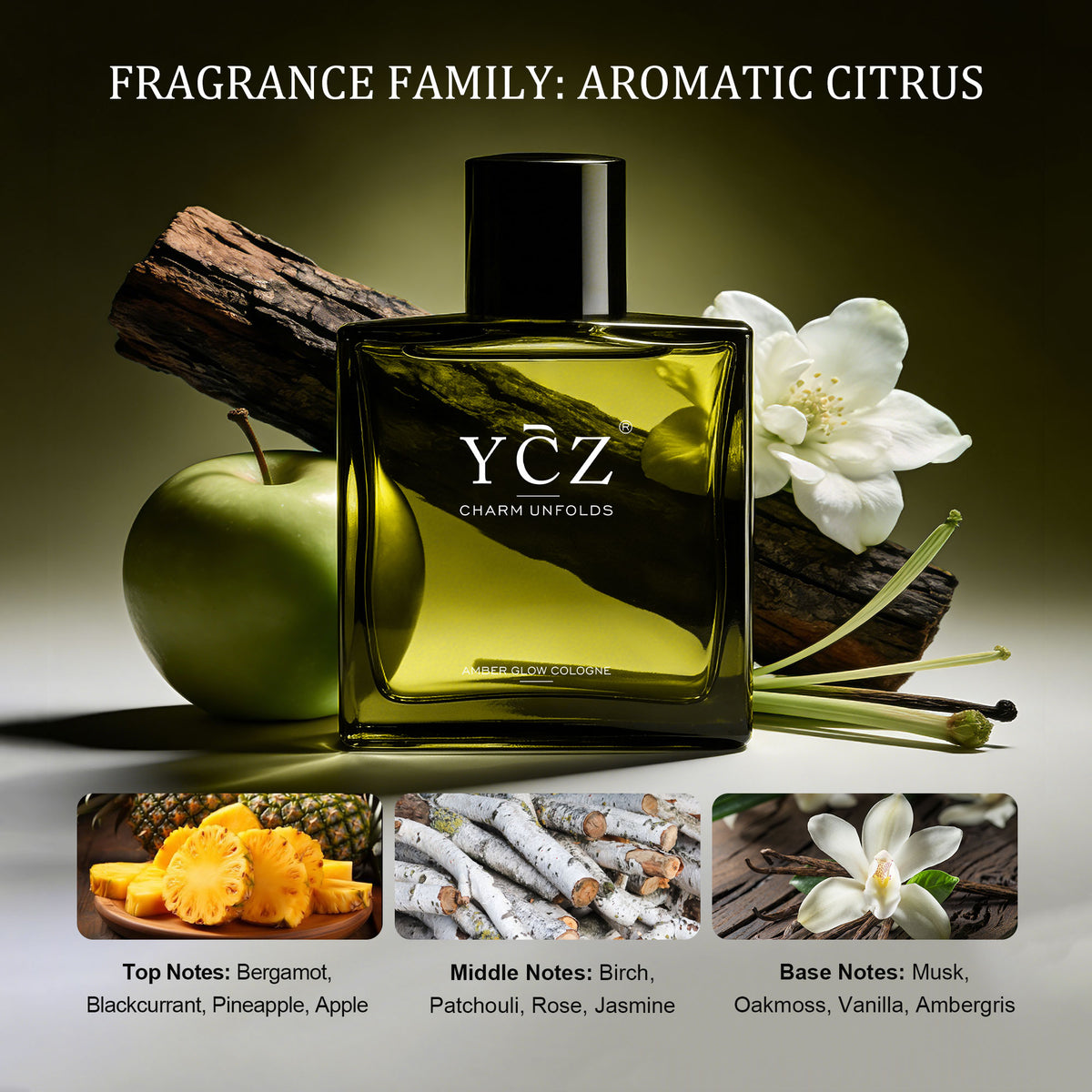 YCZ Amber Glow is a refined men’s cologne, balancing freshness and depth with modern fruity chypre elegance.