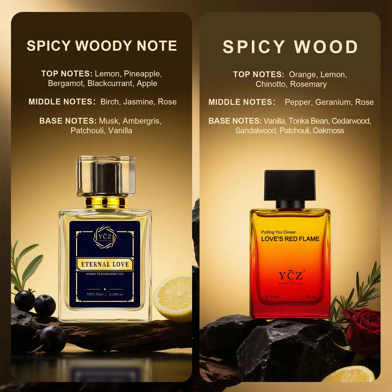 YCZ Eternal Night opens with lemon, pineapple, bergamot, blackcurrant, and apple, unfolding into birch, jasmine, and rose, before settling into musk, ambergris, patchouli, and vanilla for a smooth spicy woody trail with refined warmth.